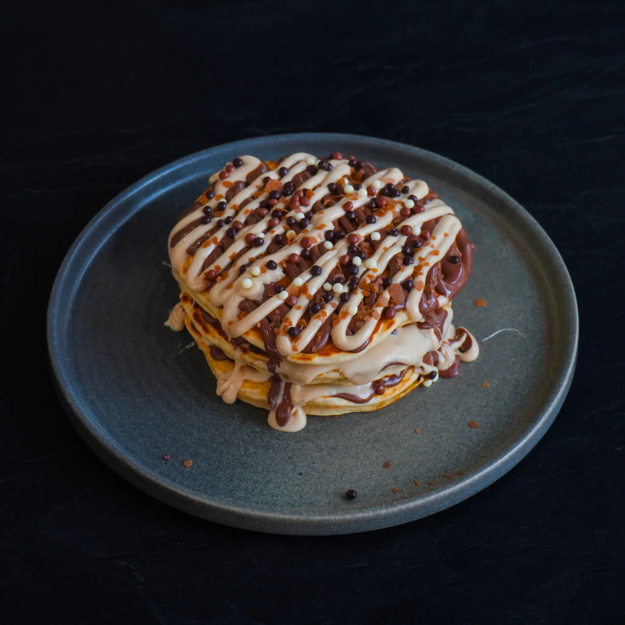 Τρία τηγανητά αυγά, μείγμα τυριών, μπέικον, σχοινόπρασο και BBQ sauce σε χειροποίητο ζυμάρι.*