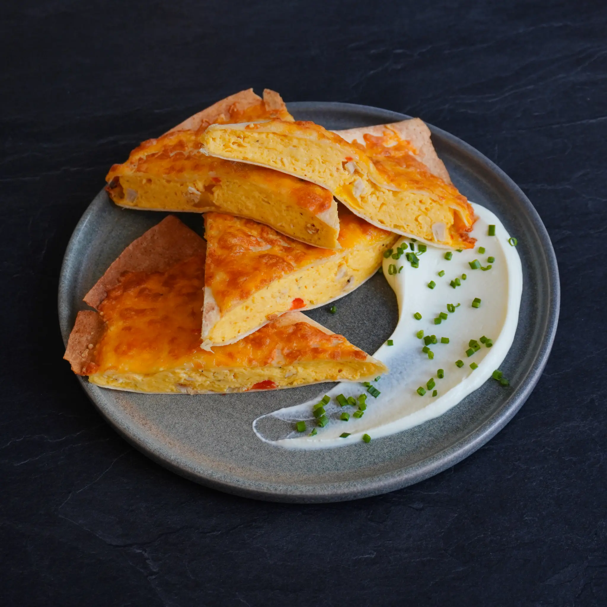 Γεμιστή τορτίγια με ομελέτα, mix τυριών, πολύχρωμες πιπεριές, ψητό κοτόπουλο και αρωματικό γιαούρτι.